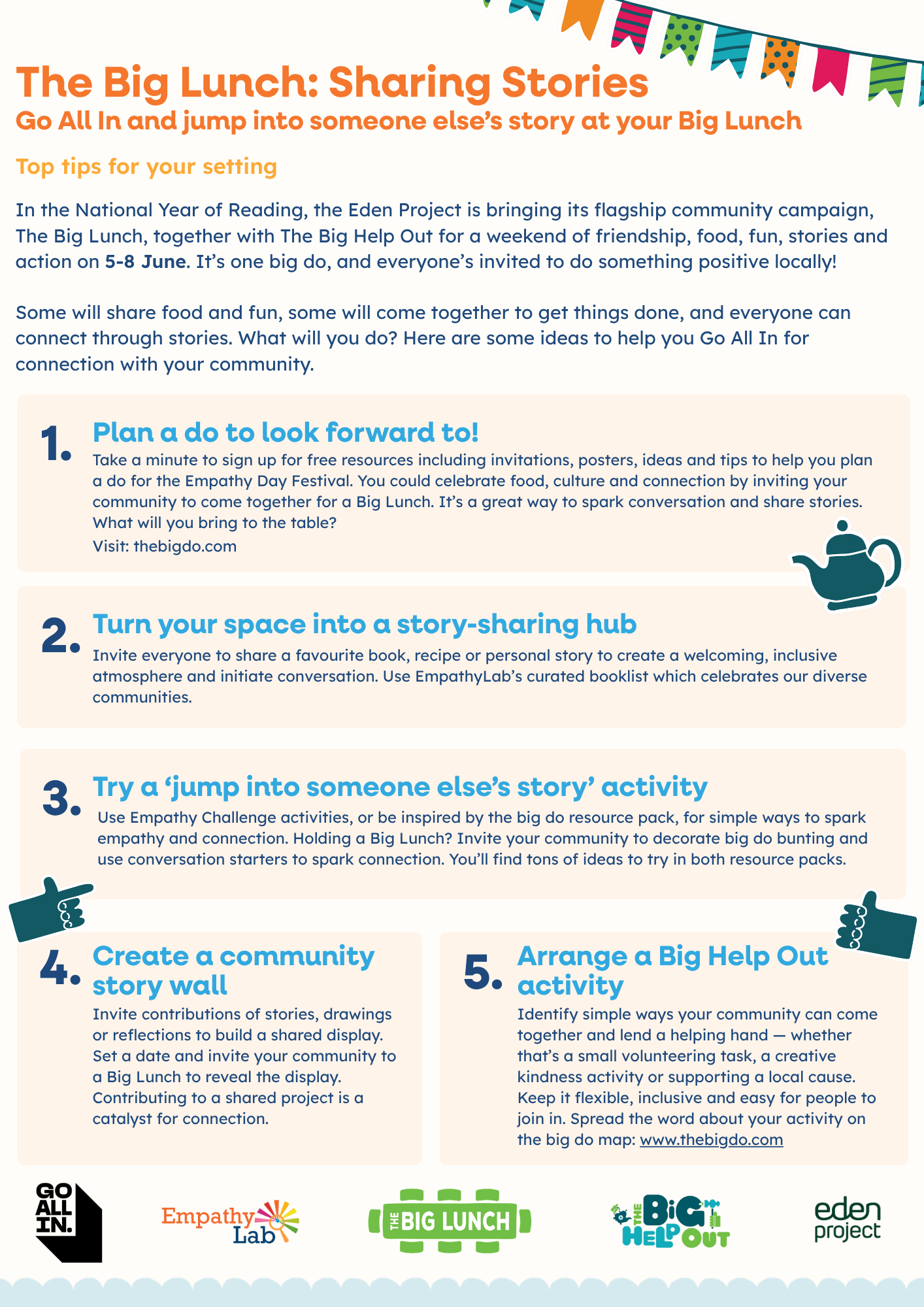 Join the annual Big Lunch celebration (5-8 June) by hosting a story-themed get-together in your school, street or community to share stories, food, fun and friendship.